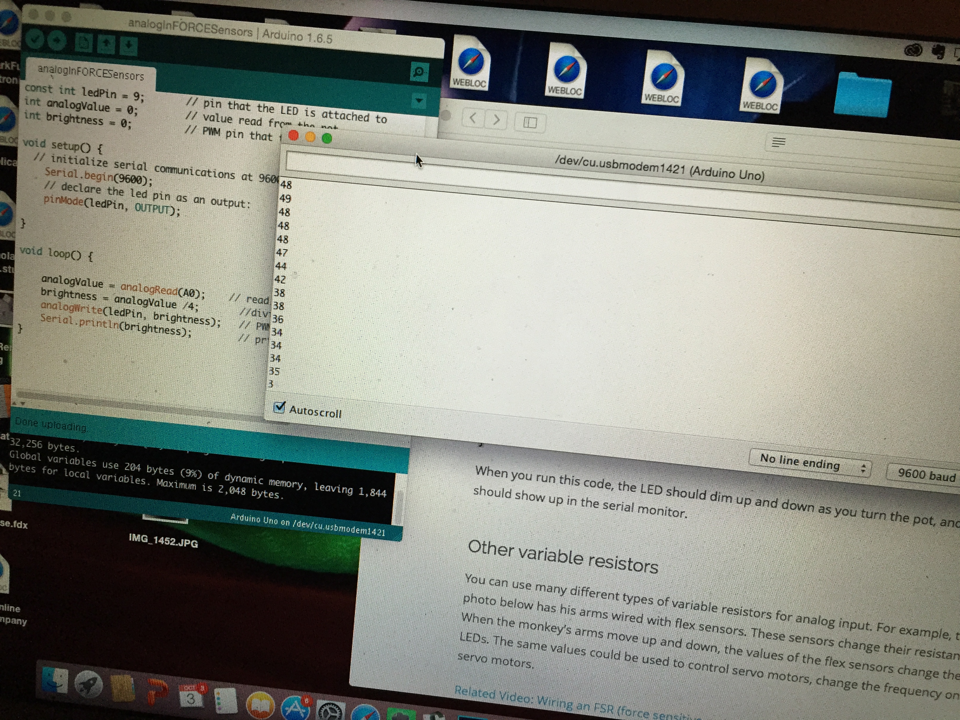 I went through some of the sketches in the lab, one of which allowed me to print a numerical reading of my analog sensor to the console, like so: