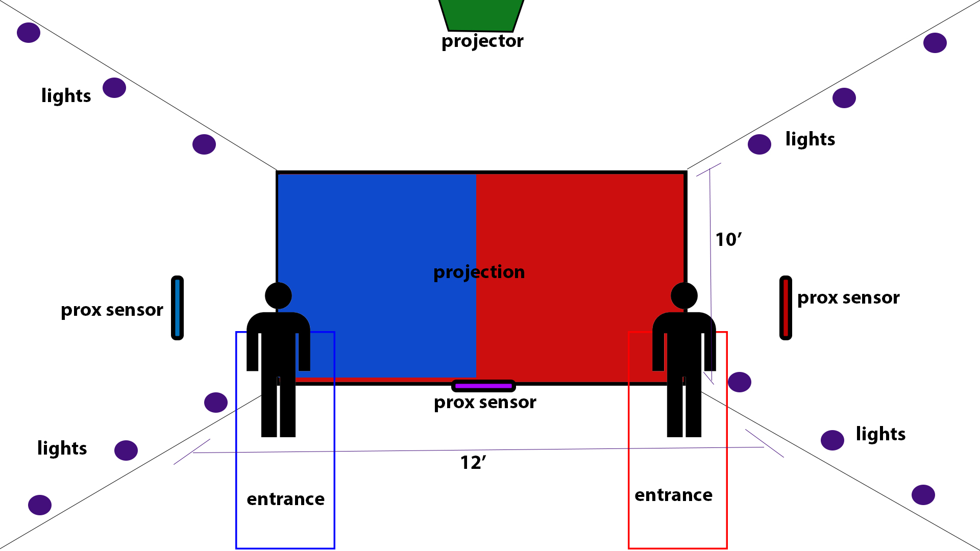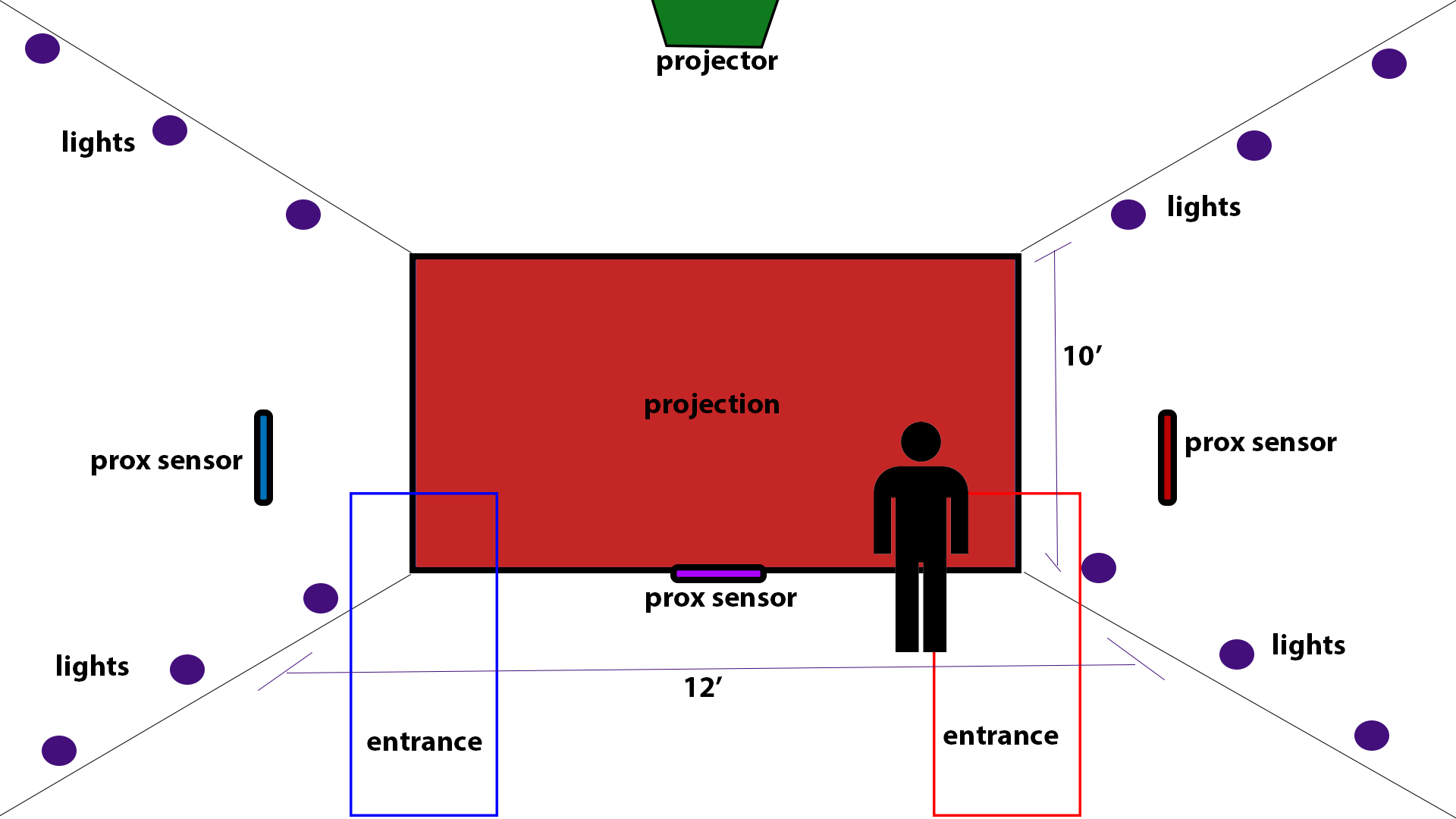 as user walks to middle of room, video and lights turns PURPLE, PURPLE AUDIO increases.